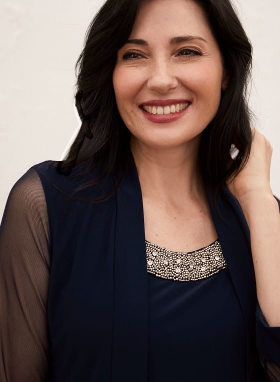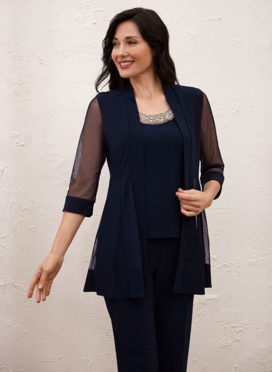 Til je avondkleding naar een hoger niveau met onze set met jack en broek met 3/4-mouwen. Het bijgevoegde hemdje voegt direct stijl toe aan deze moeiteloze look.Jack & hemdJacket met open voorkant 3/4 mesh mouwenVerbonden hemdje met halslijn met strassteentjesComfortabele en rekbare jerseystofBroekWijde pijpenComfortabele en rekbare jerseystofBinnenbeenlengte: 29"