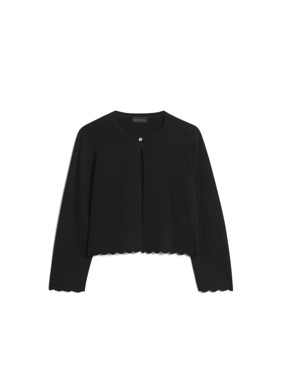 Deze bolero is met zijn geschulpte randen en sierknoopsluiting het perfecte accessoire voor frissere avonden. Draag het met een zwierige jurk met print voor een elegante avondlook.
