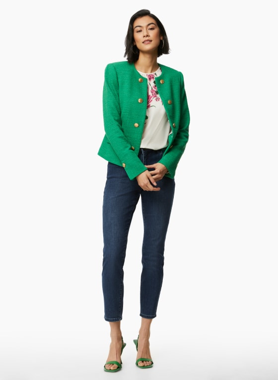 Draag een vleugje kleur in ons bouclé jack met knopen, nep klepzakken en een korte lengte. Combineer dit met een effen zwarte broek voor een strakke combo. Ronde hals Lange mouwen Manchetten met knopen Open voorzijde Twee rijen knopen Faux klepzakken Zachte en comfortabele stof Hoogste schouderpunt: 21"